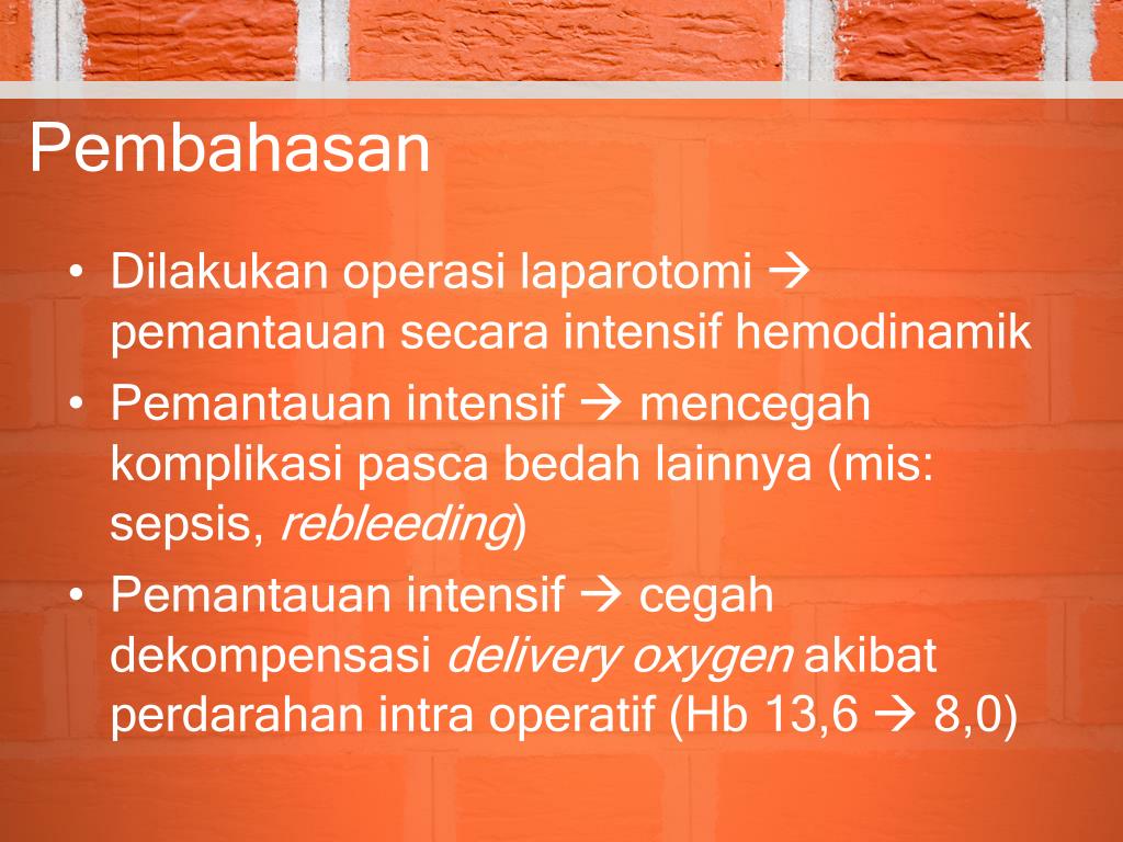 Pembahasan • Dilakukan operasi laparotomi pemantauan secara intensif hemodinamik • Pemantauan intensif mencegah komplikasi pasca bedah lainnya (mis: sepsis, rebleeding) • Pemantauan intensif cegah dekompensasi delivery oxygen akibat perdarahan intra operatif (Hb 13,6 8,0)