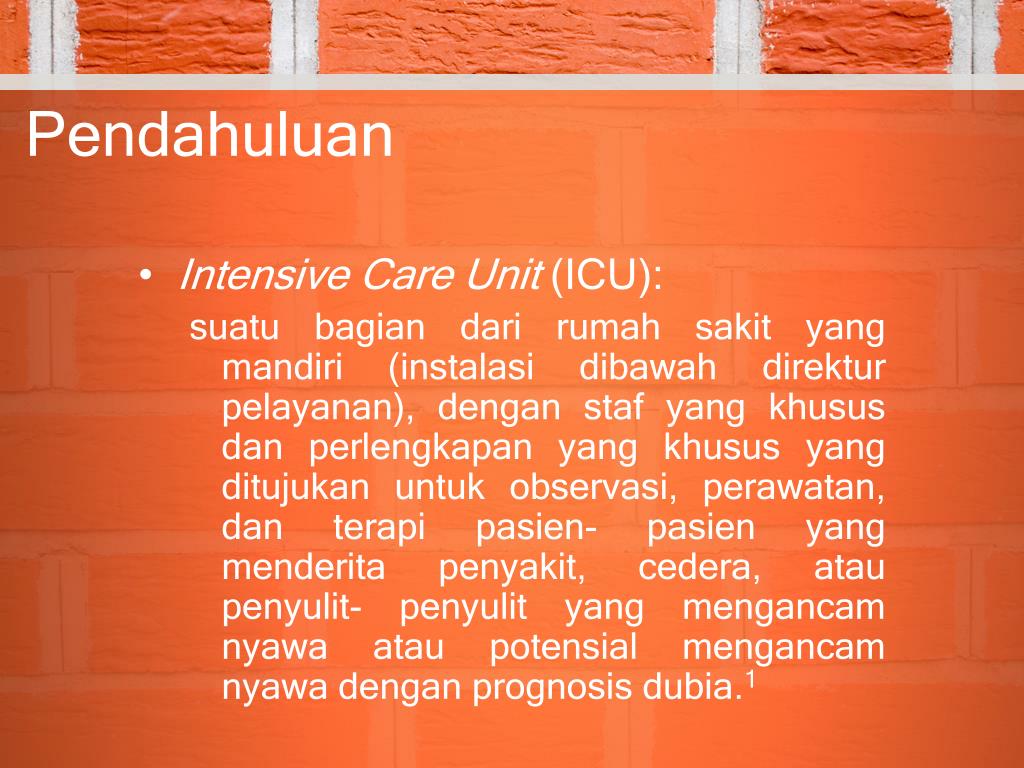 Pendahuluan • Intensive Care Unit (ICU): suatubagiandarirumahsakit yang mandiri (instalasidibawahdirekturpelayanan), denganstaf yang khususdanperlengkapan yang khusus yang ditujukanuntukobservasi, perawatan, danterapipasien- pasien yang menderitapenyakit, cedera, ataupenyulit- penyulit yang mengancamnyawaataupotensialmengancamnyawadengan prognosis dubia.1