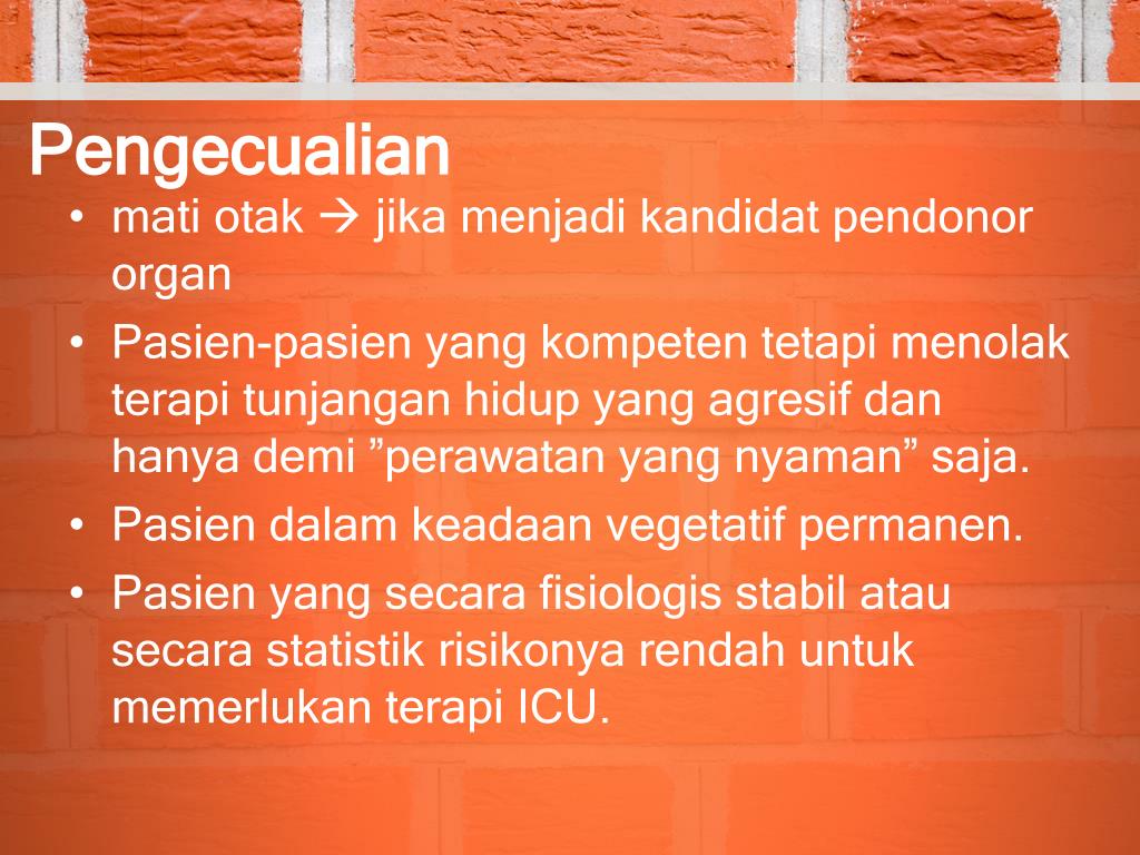 Pengecualian • mati otak jika menjadi kandidat pendonor organ • Pasien-pasien yang kompetentetapimenolakterapitunjanganhidup yang agresifdanhanyademi ”perawatan yang nyaman” saja. • Pasiendalamkeadaanvegetatifpermanen. • Pasien yang secarafisiologisstabilatausecarastatistikrisikonyarendahuntukmemerlukanterapi ICU.