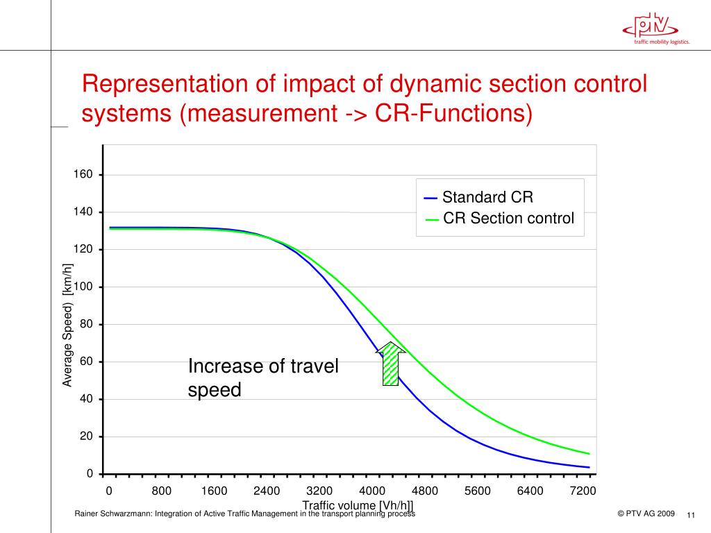 160 Standard CR 140 CR Section control 120 100 80 Average Speed) [km/h] 60 40 20 0 0 800 1600 2400 3200 4000 4800 5600 6400 7200 Traffic volume [Vh/h]] Representation of impact of dynamic section control systems (measurement -> CR-Functions) Increase of travel speed