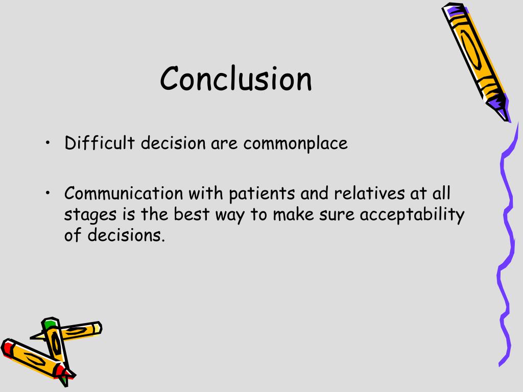 Conclusion • Difficult decision are commonplace • Communication with patients and relatives at all stages is the best way to make sure acceptability of decisions.