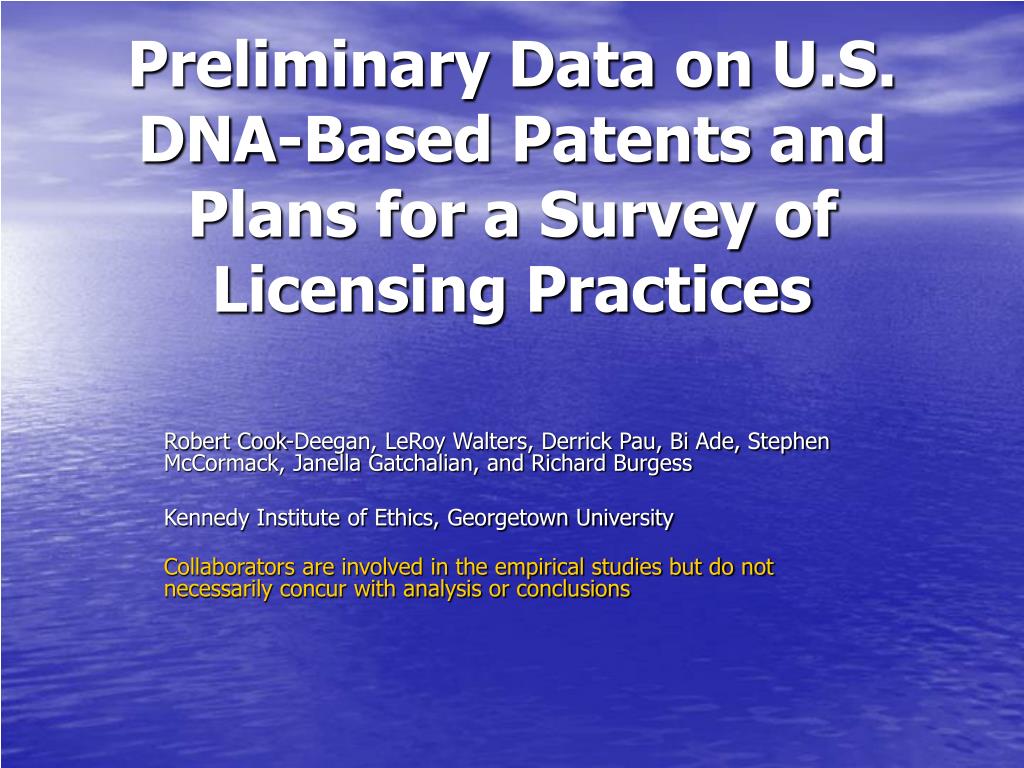 Preliminary Data on U.S. DNA-Based Patents and Plans for a Survey of Licensing Practices. Robert Cook-Deegan, LeRoy Walters, Derrick Pau, Bi Ade, Stephen McCormack, Janella Gatchalian, and Richard Burgess Kennedy Institute of Ethics, Georgetown University