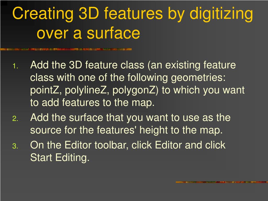 Creating 3D features by digitizing over a surface • Add the 3D feature class (an existing feature class with one of the following geometries: pointZ, polylineZ, polygonZ) to which you want to add features to the map. • Add the surface that you want to use as the source for the features' height to the map. • On the Editor toolbar, click Editor and click Start Editing.