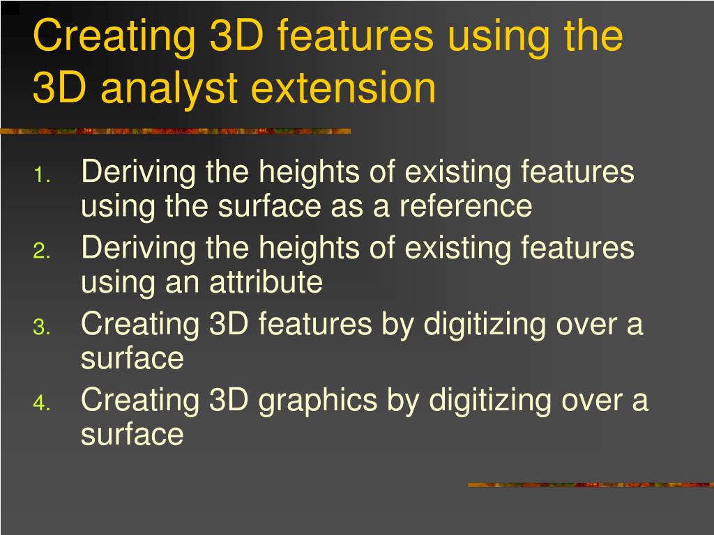 Creating 3D features using the 3D analyst extension • Deriving the heights of existing features using the surface as a reference • Deriving the heights of existing features using an attribute • Creating 3D features by digitizing over a surface • Creating 3D graphics by digitizing over a surface