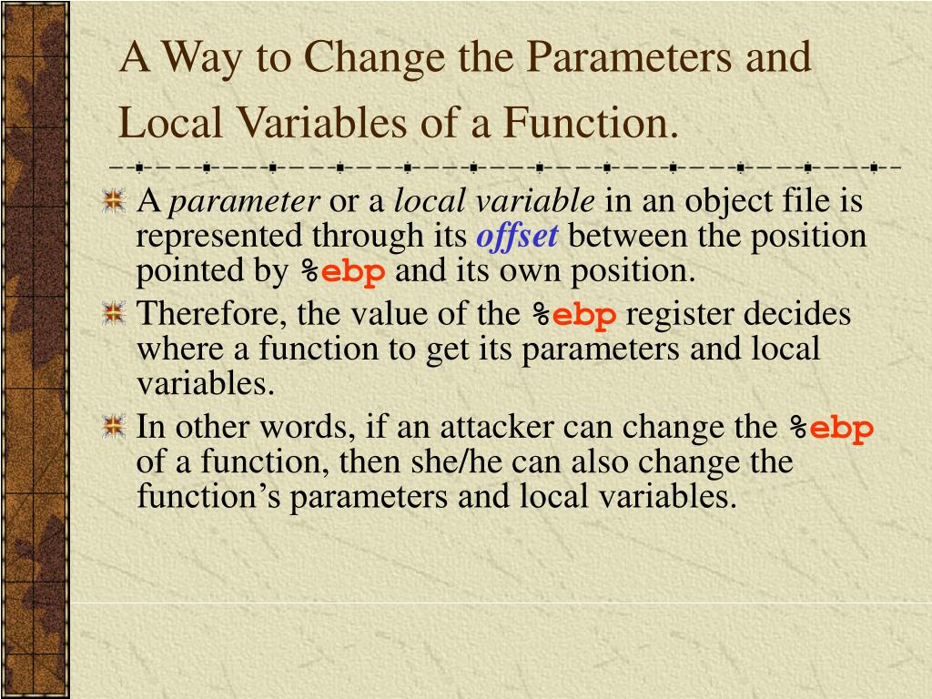 A Way to Change the Parameters and Local Variables of a Function. • A parameter or a local variable in an object file is represented through its offset between the position pointed by %ebp and its own position. • Therefore, the value of the %ebp register decides where a function to get its parameters and local variables. • In other words, if an attacker can change the %ebp of a function, then she/he can also change the function’s parameters and local variables.
