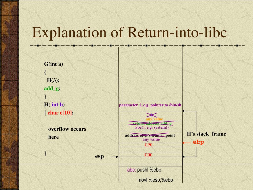 Explanation of Return-into-libc After the following two instruction in function system()’s function prologue is executed pushl %ebp movl %esp, %ebp, the position of %esp and %ebp is shown in the figure. G(int a) { H(3); add_g: } H( int b) { char c[10]; overflow occurs here } parameter 1, e.g. pointer to /bin/sh b any value return address add_g ebp any value esp H’s stack frame address of G’s frame point any value C[9] C[0] abc: pushl %ebp movl %esp,%ebp