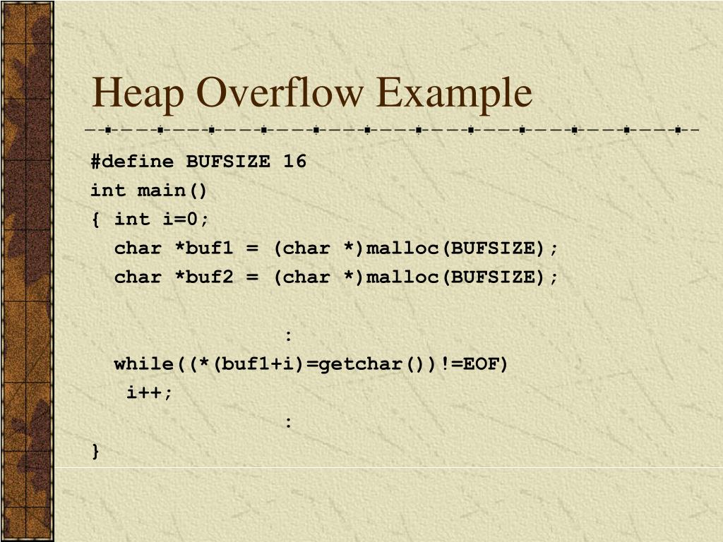 Heap Overflow Example #define BUFSIZE 16 int main() { int i=0; char *buf1 = (char *)malloc(BUFSIZE); char *buf2 = (char *)malloc(BUFSIZE); : while((*(buf1+i)=getchar())!=EOF) i++; : }