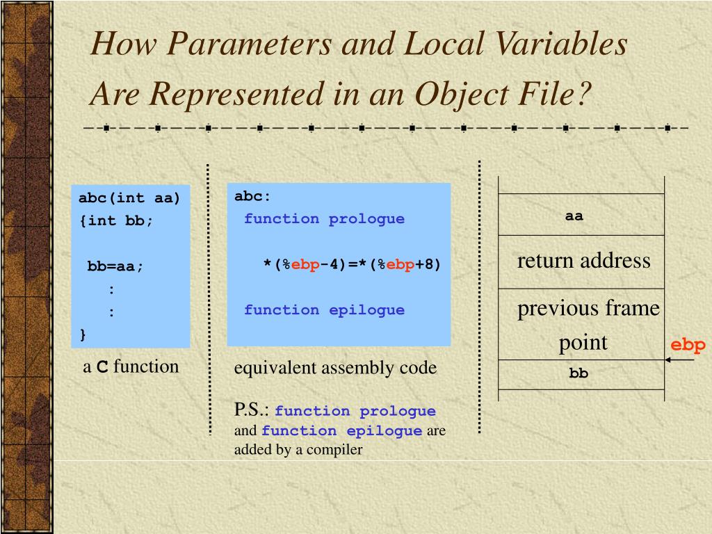 How Parameters and Local Variables Are Represented in an Object File? abc: function prologue *(%ebp-4)=*(%ebp+8) function epilogue abc(int aa) {int bb; bb=aa; : : } aa return address previous frame point ebp a C function equivalent assembly code P.S.: function prologueand function epilogueare added by a compiler bb