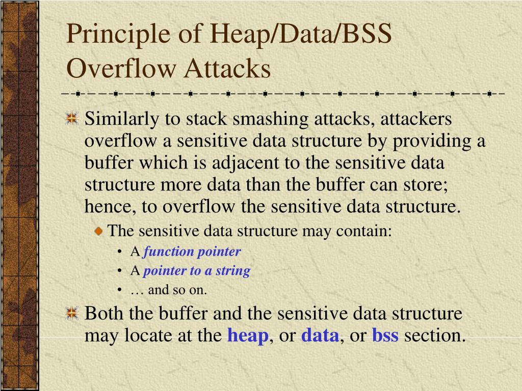 Principle of Heap/Data/BSS Overflow Attacks • Similarly to stack smashing attacks, attackers overflow a sensitive data structure by providing a buffer which is adjacent to the sensitive data structure more data than the buffer can store; hence, to overflow the sensitive data structure. • The sensitive data structure may contain: • A function pointer • A pointer to a string • … and so on. • Both the buffer and the sensitive data structure may locate at the heap, or data, or bss section.