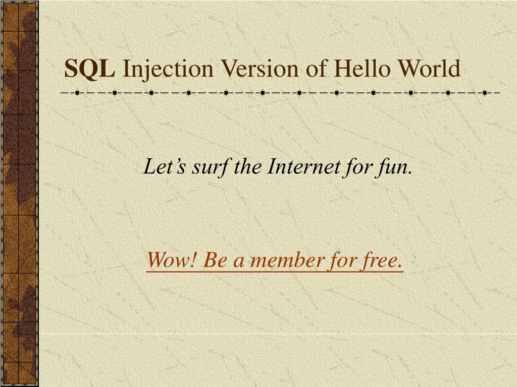 SQL Injection Version of Hello World Let’s surf the Internet for fun. Wow! Be a member for free.