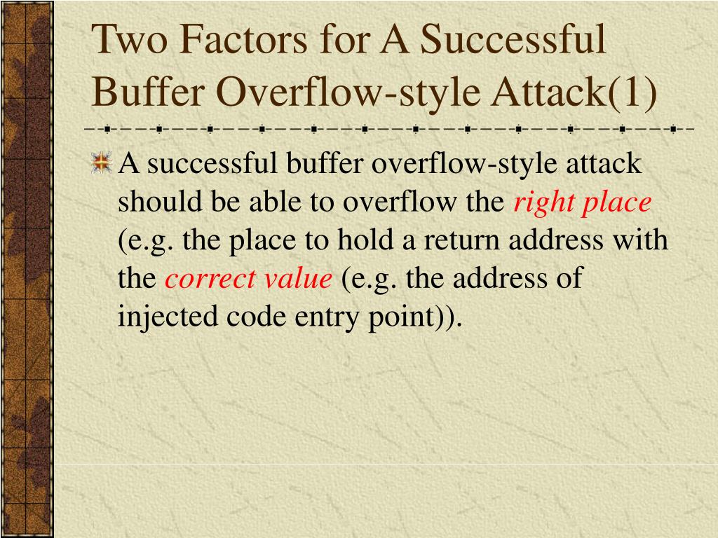 Two Factors for A Successful Buffer Overflow-style Attack(2) return address buffer where the overflow start injected code address of injected code entry point. offset between the beginning of the overflowed buffer and the overflow target. The offset and the entry point address are non-predicable. They can not decided by just looking the source code or local binary code.
