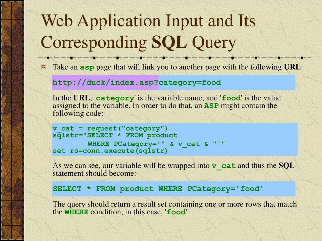 Web Application Input and Its Corresponding SQL Query • Take an asp page that will link you to another page with the following URL:http://duck/index.asp?category=foodIn the URL, 'category' is the variable name, and 'food' is the value assigned to the variable. In order to do that, an ASP might contain the following code:v_cat = request("category")sqlstr="SELECT * FROM product WHERE PCategory='" & v_cat & "'"set rs=conn.execute(sqlstr)As we can see, our variable will be wrapped into v_cat and thus the SQL statement should become:SELECT * FROM product WHERE PCategory='food'The query should return a result set containing one or more rows that match the WHERE condition, in this case, 'food'.