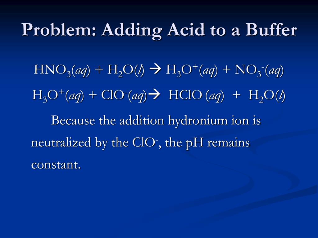 Problem: Adding Acid to a Buffer HNO3(aq) + H2O(l) H3O+(aq) + NO3-(aq) H3O+(aq) + ClO-(aq) HClO(aq) + H2O(l) Because the addition hydronium ion is neutralized by the ClO-, the pH remains constant.