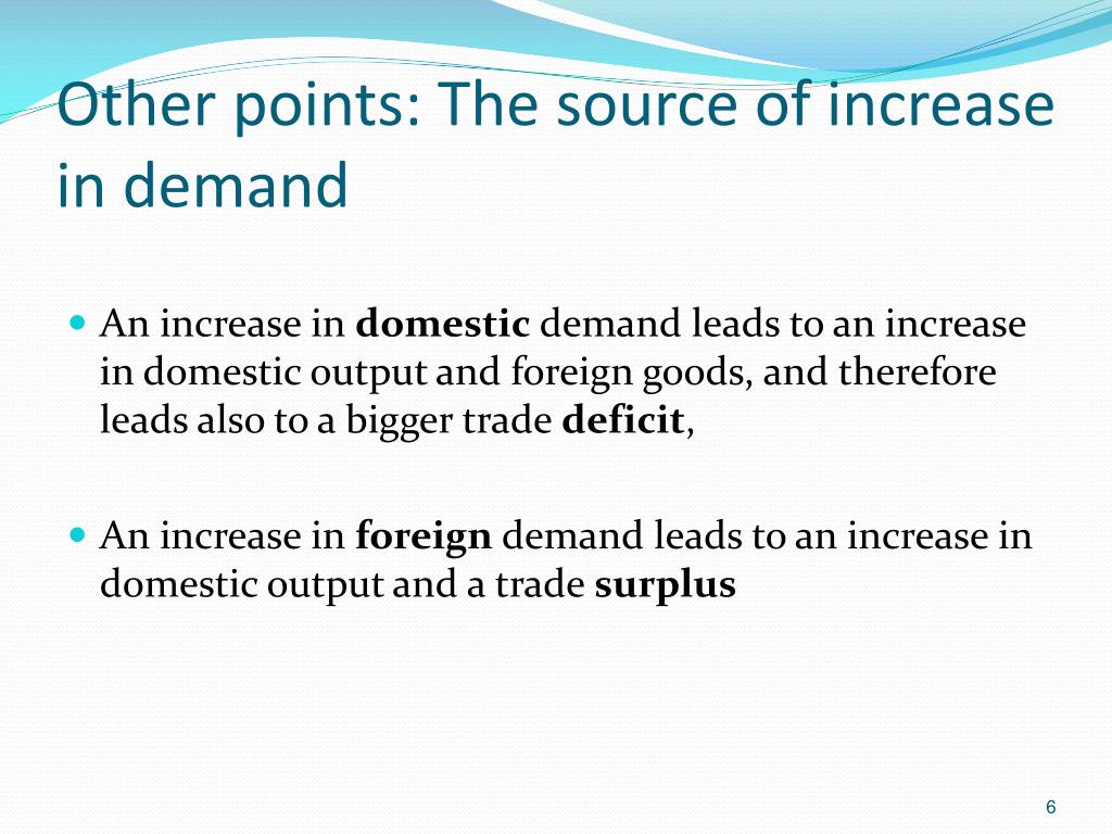 Other points: The source of increase in demand • An increase in domestic demand leads to an increase in domestic output and foreign goods, and therefore leads also to a bigger trade deficit, • An increase in foreign demand leads to an increase in domestic output and a trade surplus