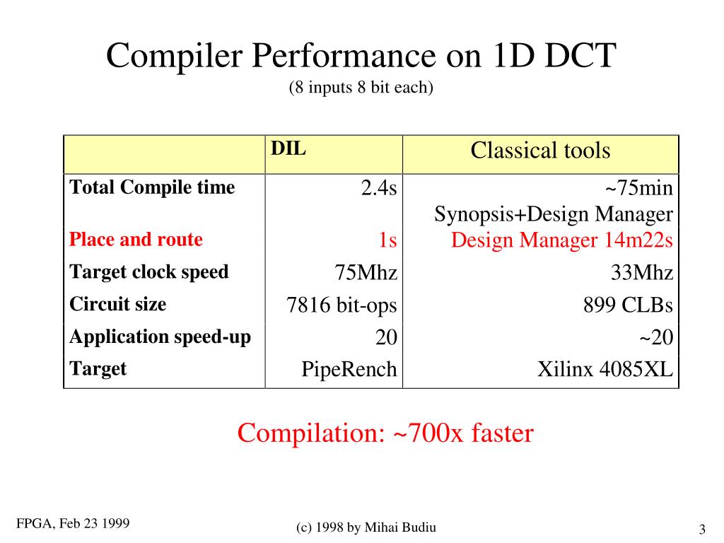 Compiler Performance on 1D DCT (8 inputs 8 bit each) Compilation: ~700x faster (c) 1998 by Mihai Budiu