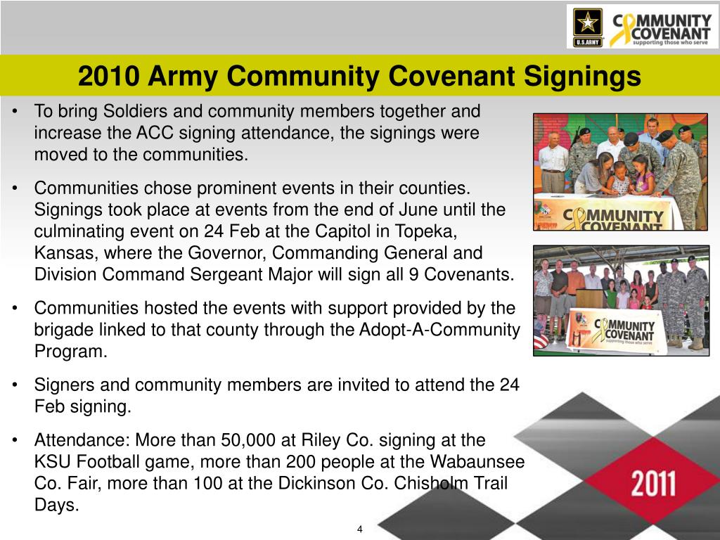 2010 Army Community Covenant Signings • To bring Soldiers and community members together and increase the ACC signing attendance, the signings were moved to the communities. • Communities chose prominent events in their counties. Signings took place at events from the end of June until the culminating event on 24 Feb at the Capitol in Topeka, Kansas, where the Governor, Commanding General and Division Command Sergeant Major will sign all 9 Covenants. • Communities hosted the events with support provided by the brigade linked to that county through the Adopt-A-Community Program. • Signers and community members are invited to attend the 24 Feb signing. • Attendance: More than 50,000 at Riley Co. signing at the KSU Football game, more than 200 people at the Wabaunsee Co. Fair, more than 100 at the Dickinson Co. Chisholm Trail Days.