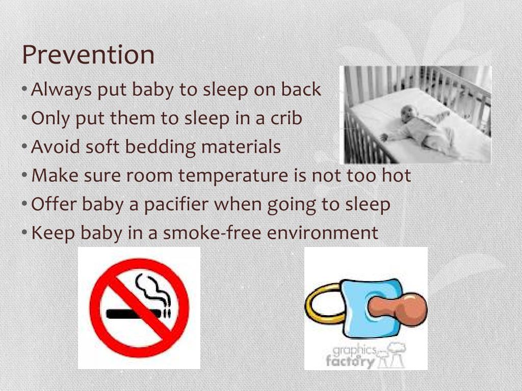 Prevention • Always put baby to sleep on back • Only put them to sleep in a crib • Avoid soft bedding materials • Make sure room temperature is not too hot • Offer baby a pacifier when going to sleep • Keep baby in a smoke-free environment