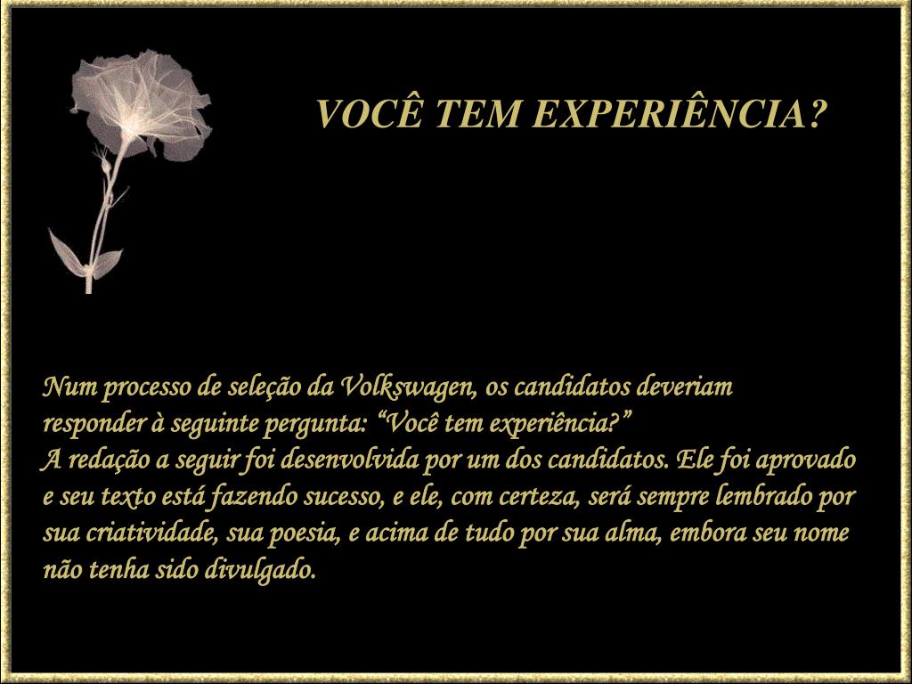 VOCÊ TEM EXPERIÊNCIA? Num processo de seleção da Volkswagen, os candidatos deveriam responder à seguinte pergunta: “Você tem experiência?” A redação a seguir foi desenvolvida por um dos candidatos. Ele foi aprovado e seu texto está fazendo sucesso, e ele, com certeza, será sempre lembrado por sua criatividade, sua poesia, e acima de tudo por sua alma, embora seu nome não tenha sido divulgado.