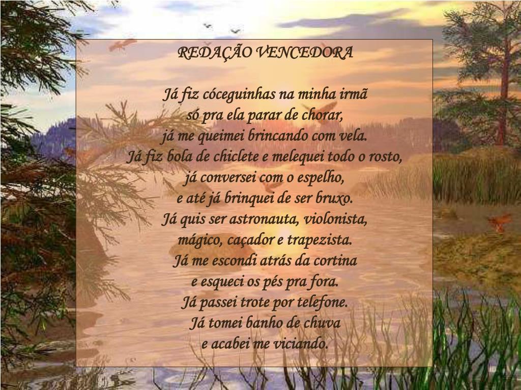 REDAÇÃO VENCEDORAJá fiz cóceguinhas na minha irmã só pra ela parar de chorar, já me queimei brincando com vela. Já fiz bola de chiclete e melequei todo o rosto, já conversei com o espelho, e até já brinquei de ser bruxo.Já quis ser astronauta, violonista, mágico, caçador e trapezista.Já me escondi atrás da cortina e esqueci os pés pra fora. Já passei trote por telefone.Já tomei banho de chuva e acabei me viciando.