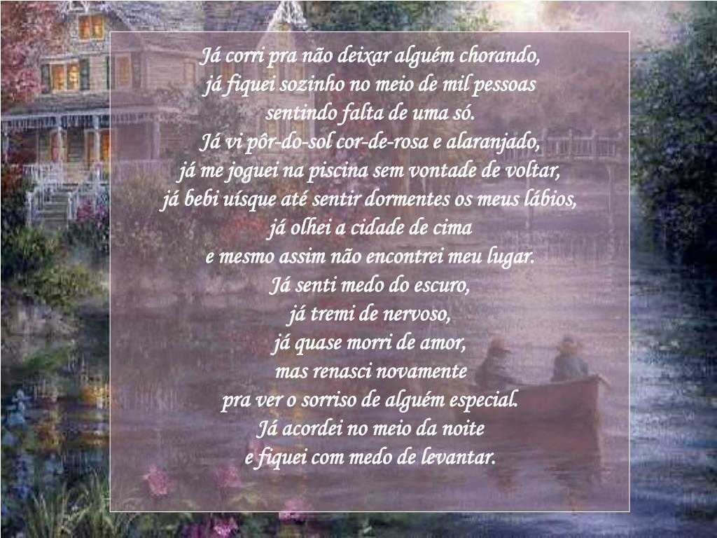 Já corri pra não deixar alguém chorando, já fiquei sozinho no meio de mil pessoas sentindo falta de uma só. Já vi pôr-do-sol cor-de-rosa e alaranjado, já me joguei na piscina sem vontade de voltar, já bebi uísque até sentir dormentes os meus lábios, já olhei a cidade de cima e mesmo assim não encontrei meu lugar.Já senti medo do escuro, já tremi de nervoso, já quase morri de amor, mas renasci novamente pra ver o sorriso de alguém especial. Já acordei no meio da noite e fiquei com medo de levantar.