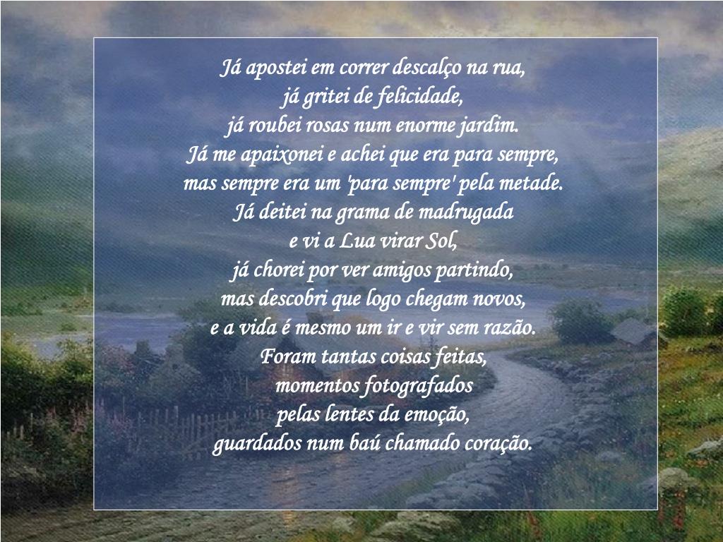 Já apostei em correr descalço na rua, já gritei de felicidade, já roubei rosas num enorme jardim.Já me apaixonei e achei que era para sempre, mas sempre era um 'para sempre' pela metade. Já deitei na grama de madrugada e vi a Lua virar Sol, já chorei por ver amigos partindo, mas descobri que logo chegam novos, e a vida é mesmo um ir e vir sem razão.Foram tantas coisas feitas, momentos fotografados pelas lentes da emoção,guardados num baú chamado coração.