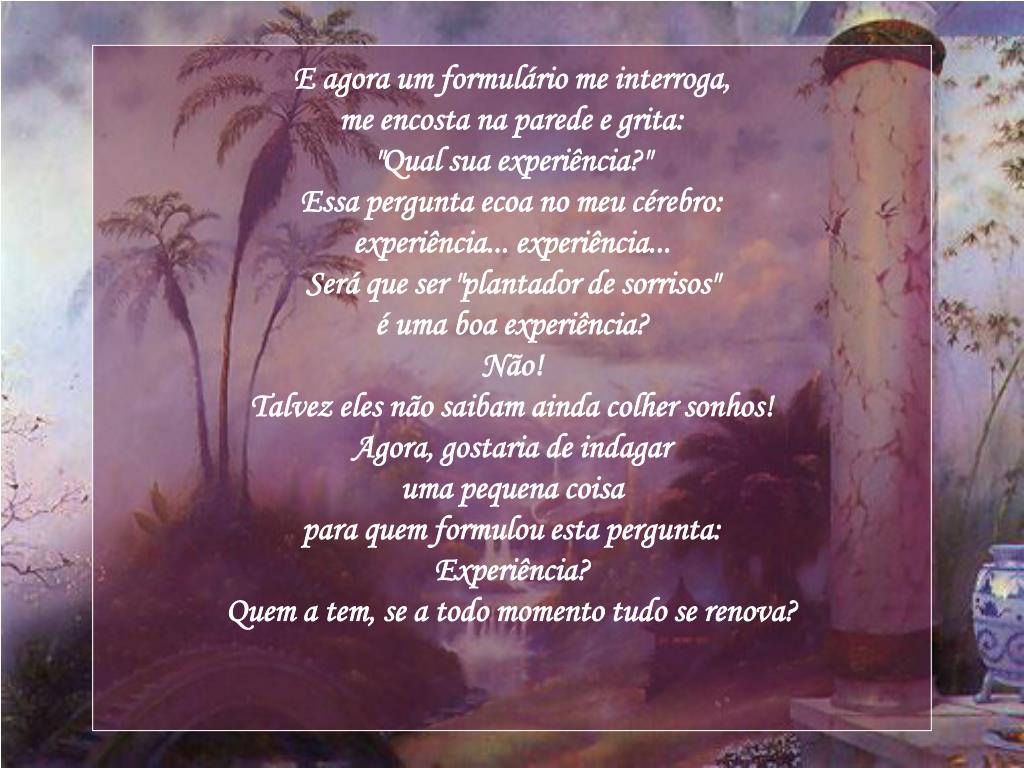 E agora um formulário me interroga, me encosta na parede e grita: "Qual sua experiência?" Essa pergunta ecoa no meu cérebro: experiência... experiência... Será que ser "plantador de sorrisos" é uma boa experiência? Não! Talvez eles não saibam ainda colher sonhos!Agora, gostaria de indagar uma pequena coisa para quem formulou esta pergunta:Experiência? Quem a tem, se a todo momento tudo se renova?