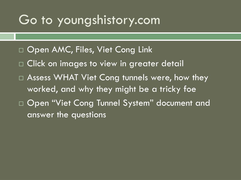 Go to youngshistory.com • Open AMC, Files, Viet Cong Link • Click on images to view in greater detail • Assess WHAT Viet Cong tunnels were, how they worked, and why they might be a tricky foe • Open “Viet Cong Tunnel System” document and answer the questions