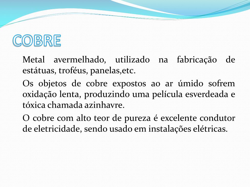 COBRE Metal avermelhado, utilizado na fabricação de estátuas, troféus, panelas,etc. Os objetos de cobre expostos ao ar úmido sofrem oxidação lenta, produzindo uma película esverdeada e tóxica chamada azinhavre. O cobre com alto teor de pureza é excelente condutor de eletricidade, sendo usado em instalações elétricas.