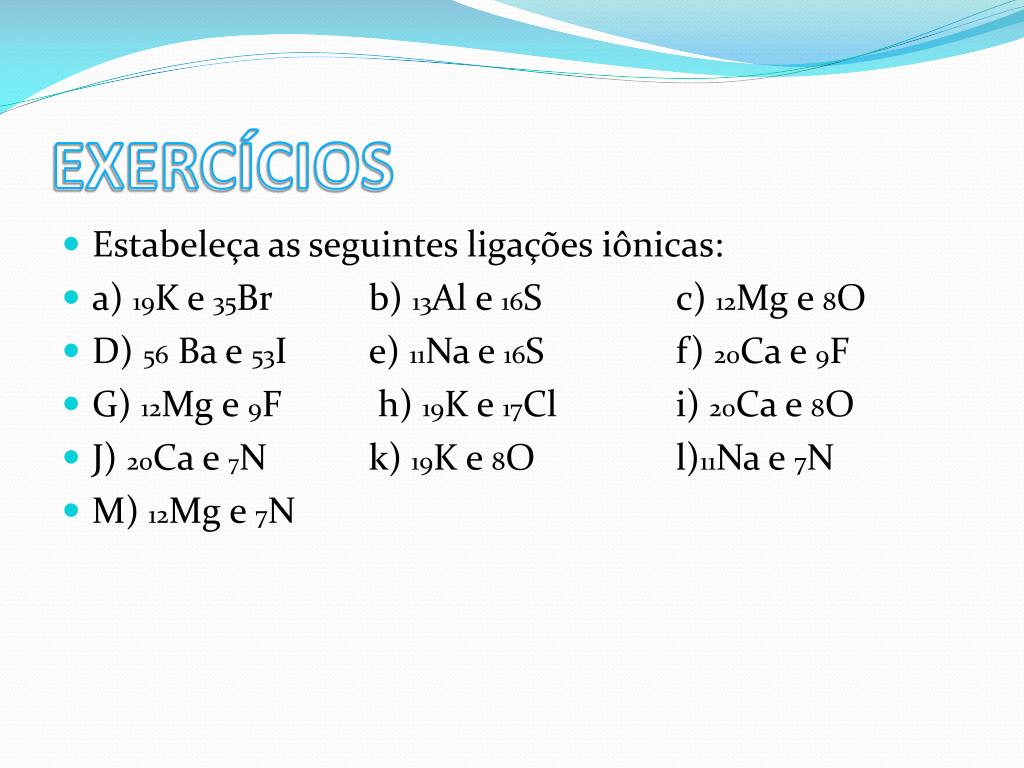 EXERCÍCIOS • Estabeleça as seguintes ligações iônicas: • a) 19K e 35Br b) 13Al e 16S c) 12Mg e 8O • D) 56Ba e 53I e) 11Na e 16S f) 20Ca e 9F • G) 12Mg e 9F h) 19K e 17Cl i) 20Ca e 8O • J) 20Ca e 7N k) 19K e 8O l)11Na e 7N • M) 12Mg e 7N