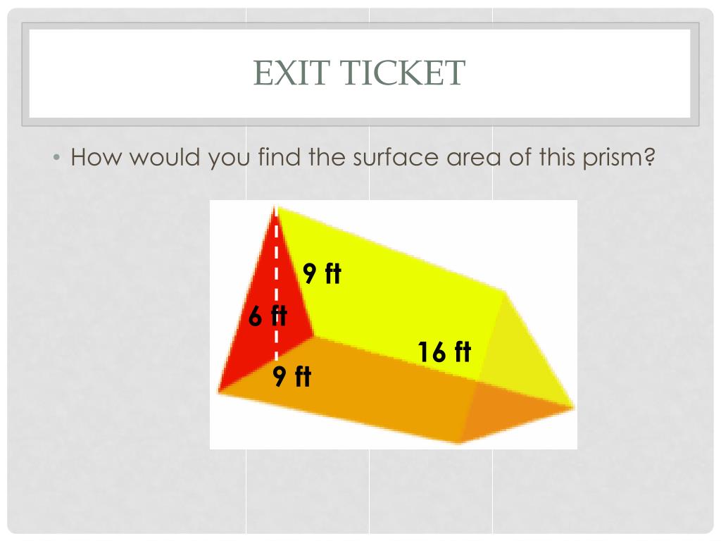 Exit Ticket • How would you find the surface area of this prism? 9 ft 6 ft 16 ft 9 ft
