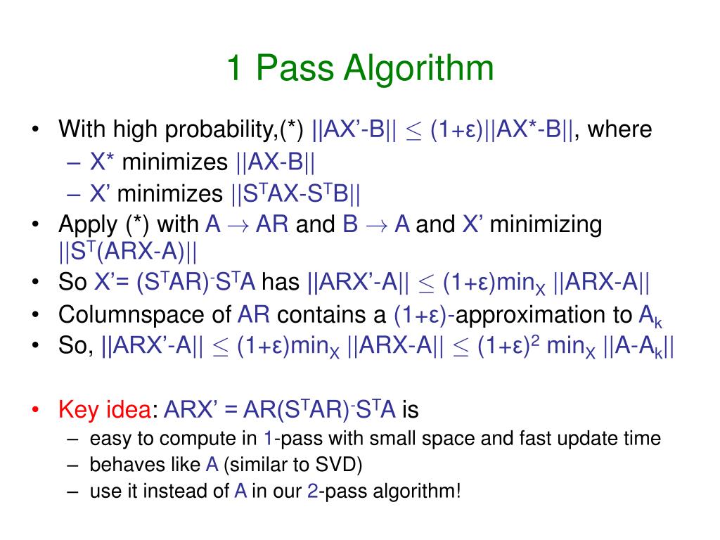 1 Pass Algorithm • With high probability,(*) ||AX’-B|| · (1+ε)||AX*-B||, where • X* minimizes ||AX-B|| • X’ minimizes ||STAX-STB|| • Apply (*) with A ! AR and B ! A and X’ minimizing ||ST(ARX-A)|| • So X’= (STAR)-STA has ||ARX’-A|| · (1+ε)minX ||ARX-A|| • Columnspace of AR contains a (1+ε)-approximation to Ak • So, ||ARX’-A|| · (1+ε)minX ||ARX-A|| · (1+ε)2 minX ||A-Ak|| • Key idea: ARX’ = AR(STAR)-STA is • easy to compute in 1-pass with small space and fast update time • behaves like A (similar to SVD) • use it instead of A in our 2-pass algorithm!