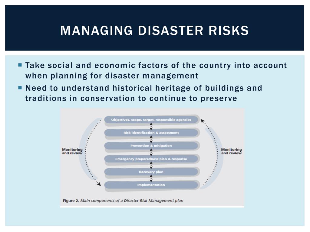 Managing Disaster Risks • Take social and economic factors of the country into account when planning for disaster management • Need to understand historical heritage of buildings and traditions in conservation to continue to preserve