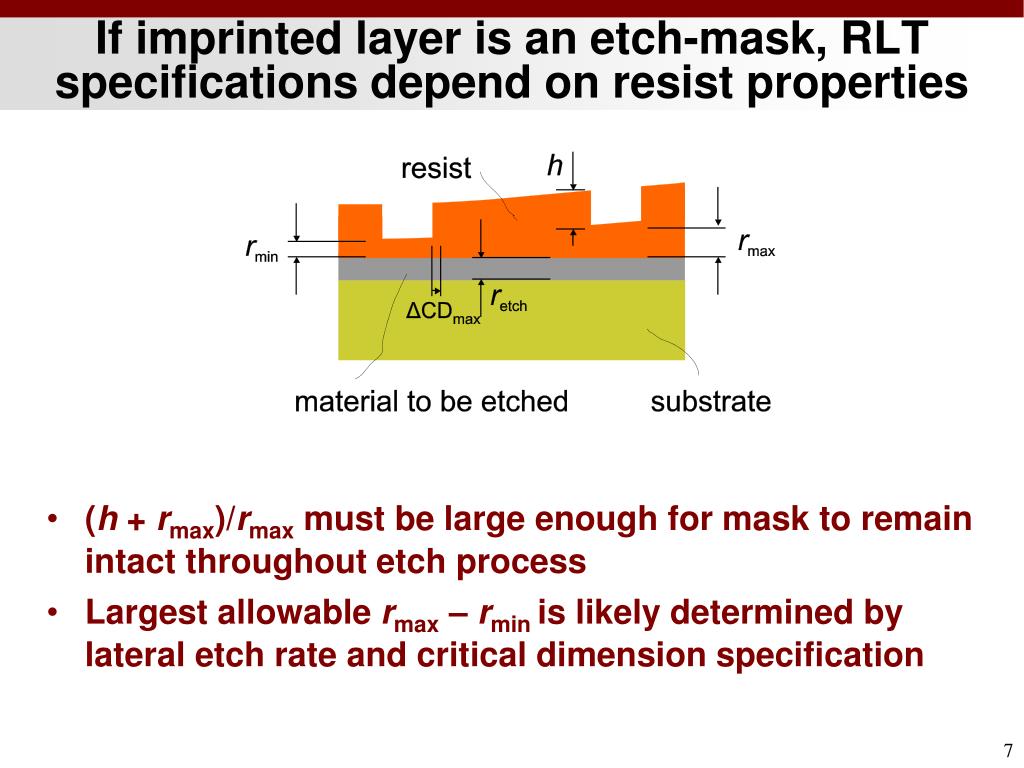 If imprinted layer is an etch-mask, RLT specifications depend on resist properties • (h + rmax)/rmax must be large enough for mask to remain intact throughout etch process • Largest allowable rmax – rminis likely determined by lateral etch rate and critical dimension specification