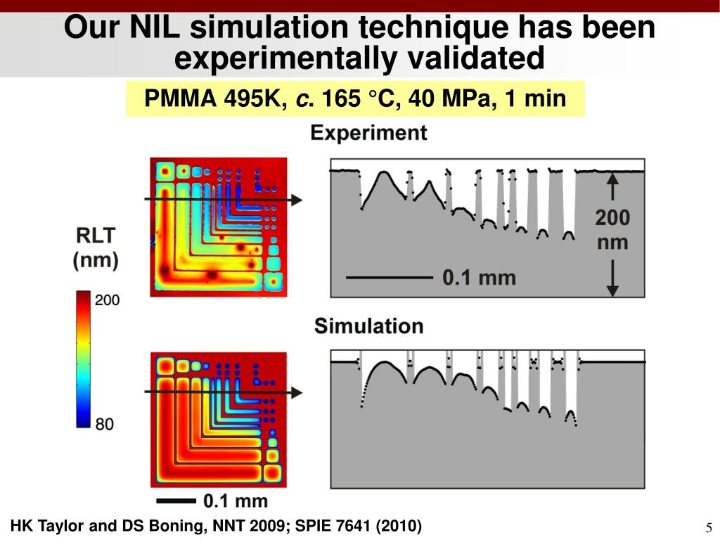 Our NIL simulation technique has been experimentally validated PMMA 495K, c. 165 °C, 40 MPa, 1 min HK Taylor and DS Boning, NNT 2009; SPIE 7641 (2010)