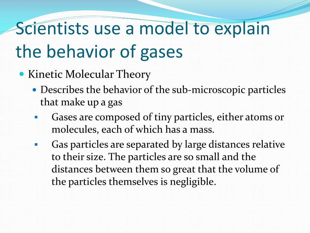 Scientists use a model to explain the behavior of gases • Kinetic Molecular Theory • Describes the behavior of the sub-microscopic particles that make up a gas • Gases are composed of tiny particles, either atoms or molecules, each of which has a mass. • Gas particles are separated by large distances relative to their size. The particles are so small and the distances between them so great that the volume of the particles themselves is negligible.