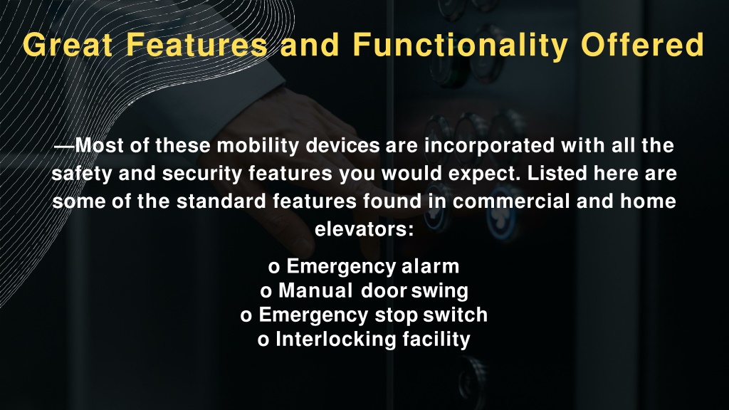 Great Features andFunctionality Offered —Mostofthesemobilitydevicesareincorporatedwithallthe safetyandsecurityfeaturesyouwouldexpect.Listedhereare someofthestandardfeaturesfoundincommercialandhome elevators: o Emergencyalarm o Manual doorswing o Emergency stopswitch o Interlockingfacility