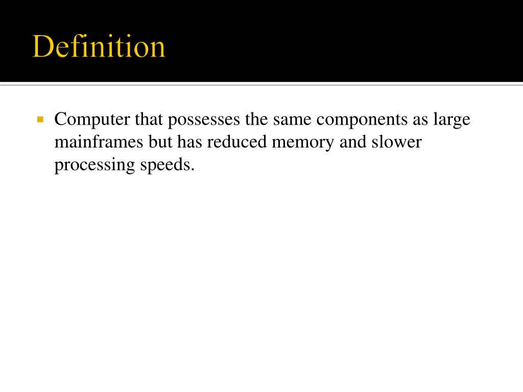 Definition • Computer that possesses the same components as large mainframes but has reduced memory and slower processing speeds.