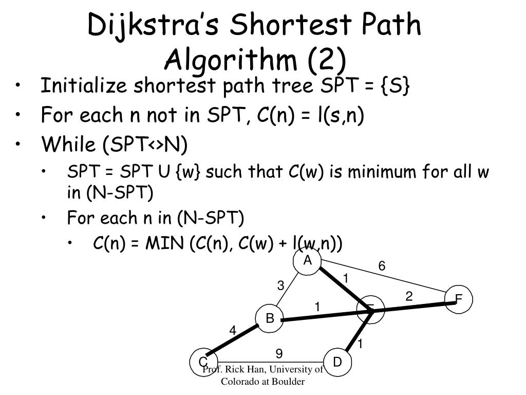 Dijkstra’s Shortest Path Algorithm (2) • Initialize shortest path tree SPT = {S} • For each n not in SPT, C(n) = l(s,n) • While (SPT<>N) • SPT = SPT U {w} such that C(w) is minimum for all w in (N-SPT) • For each n in (N-SPT) • C(n) = MIN (C(n), C(w) + l(w,n)) Prof. Rick Han, University of Colorado at Boulder