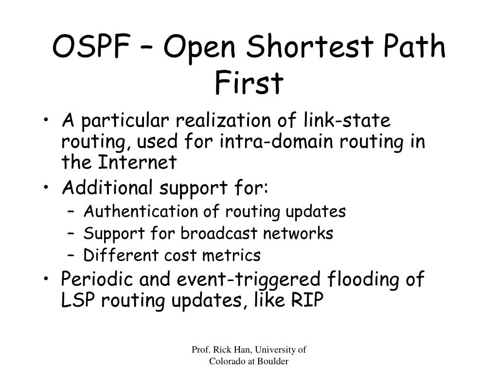 OSPF – Open Shortest Path First • A particular realization of link-state routing, used for intra-domain routing in the Internet • Additional support for: • Authentication of routing updates • Support for broadcast networks • Different cost metrics • Periodic and event-triggered flooding of LSP routing updates, like RIP Prof. Rick Han, University of Colorado at Boulder