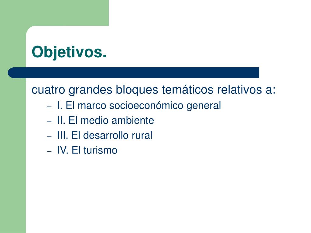 Objetivos. cuatro grandes bloques temáticos relativos a: • I. El marco socioeconómico general • II. El medio ambiente • III. El desarrollo rural • IV. El turismo