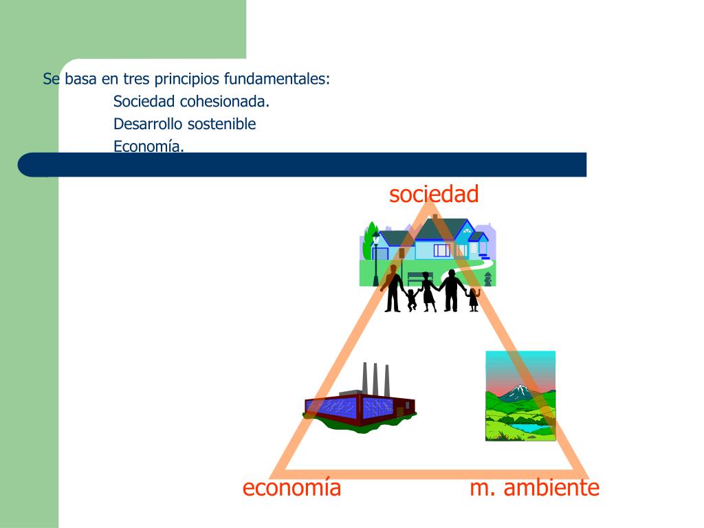 sociedad economía m. ambiente Se basa en tres principios fundamentales: Sociedad cohesionada. Desarrollo sostenible Economía.
