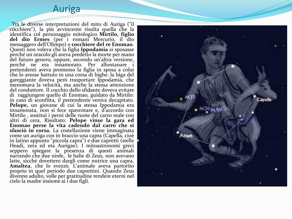 Auriga Tra le diverse interpretazioni del mito di Auriga ("il cocchiere"), la più avvincente risulta quella che la identifica col personaggio mitologico Mirtilo, figlio del dio Ermes (per i romani Mercurio, il dio messaggero dell'Olimpo) e cocchiere del re Enomao. Questi non voleva che la figlia Ippodamiasi sposasse perché un oracolo gli aveva predetto la morte per mano del futuro genero, oppure, secondo un'altra versione, perché ne era innamorato. Per allontanare i pretendenti aveva promesso la figlia in sposa a colui che lo avesse battuto in una corsa di bighe: la biga del gareggiante doveva però trasportare Ippodamia, che menomava la velocità, ma anche la stessa attenzione del conduttore. Il cocchio dello sfidante doveva evitare di raggiungere quello di Enomao, guidato da Mirtilo: in caso di sconfitta, il pretendente veniva decapitato. Pelope, un giovane di cui la stessa Ippodamia era innamorata, non si fece spaventare e, d'accordo con Mirtilo , sostituì i perni delle ruote del carro reale con altri di cera. Risultato: Pelope vinse la gara ed Enomao perse la vita cadendo dal carro che si sfasciò in corsa. La costellazione viene immaginata come un auriga con in braccio una capra (Capella, cioè in latino appunto "piccola capra") e due capretti (stelle Headi, zeta ed etaAurigae). I mitoastronomi greci seppero spiegare la presenza di questi animali narrando che due ninfe, le balie di Zeus, non avevano latte, sicché dovettero dargli come nutrice una capra, Amaltea, che lo svezzò. L'animale aveva partorito proprio in quel periodo due caprettini. Quando Zeus divenne adulto, volle per gratitudine rendere eterni nel cielo la madre insieme ai i due figli.