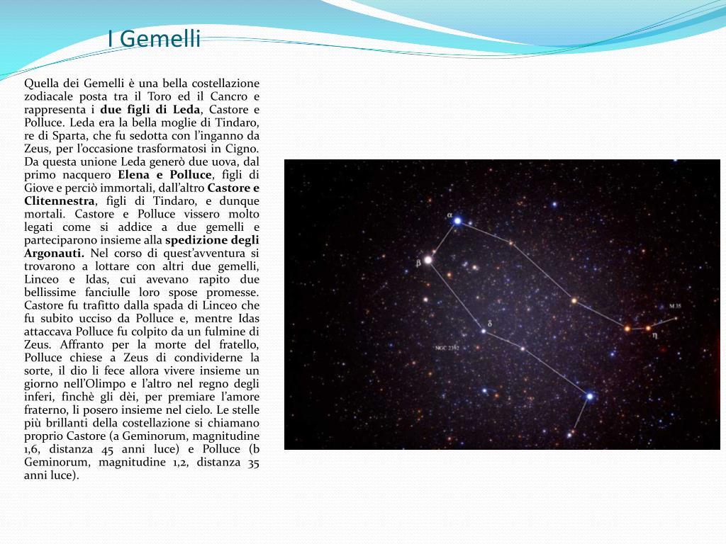 I Gemelli Quella dei Gemelli è una bella costellazione zodiacale posta tra il Toro ed il Cancro e rappresenta i due figli di Leda, Castore e Polluce. Leda era la bella moglie di Tindaro, re di Sparta, che fu sedotta con l’inganno da Zeus, per l’occasione trasformatosi in Cigno. Da questa unione Leda generò due uova, dal primo nacquero Elena e Polluce, figli di Giove e perciò immortali, dall’altro Castore e Clitennestra, figli di Tindaro, e dunque mortali. Castore e Polluce vissero molto legati come si addice a due gemelli e parteciparono insieme alla spedizione degli Argonauti. Nel corso di quest’avventura si trovarono a lottare con altri due gemelli, Linceo e Idas, cui avevano rapito due bellissime fanciulle loro spose promesse. Castore fu trafitto dalla spada di Linceo che fu subito ucciso da Polluce e, mentre Idas attaccava Polluce fu colpito da un fulmine di Zeus. Affranto per la morte del fratello, Polluce chiese a Zeus di condividerne la sorte, il dio li fece allora vivere insieme un giorno nell’Olimpo e l’altro nel regno degli inferi, finchè gli dèi, per premiare l’amore fraterno, li posero insieme nel cielo. Le stelle più brillanti della costellazione si chiamano proprio Castore (a Geminorum, magnitudine 1,6, distanza 45 anni luce) e Polluce (b Geminorum, magnitudine 1,2, distanza 35 anni luce).