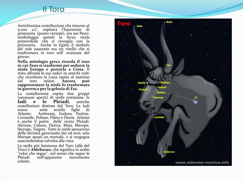 Il Toro Antichissima costellazione che intorno al 5.000 a.C. ospitava l’Equinozio di primavera (punto vernale), ora nei Pesci: simboleggia quindi la forza vitale primordiale che si risveglia con la primavera. Anche in Egitto il simbolo del sole nascente era un vitello che si trasformava in toro coll’ avanzare del giorno. Nella mitologia greca ricorda il toro in cui Zeus si trasformò per sedurre la ninfa Europa e portarla a Creta. Il mito affonda le sue radici in antichi culti che ricordano la Luna rapita al mattino dal toro solare. Ancora può rappresentare la ninfa Io trasformata in giovenca per la gelosia di Era. La costellazione ospita due gruppi (ammassi aperti) di stelle notissime: le Iadi e le Pleiadi, antiche costellazioni distinte dal Toro. Le Iadi erano sette sorelle figlie di Atlante: Ambrosia, Eudora, Pasitoe, Coronide, Polisso, Fileto e Dione. Atlante è anche il padre delle vicine Pleiadi: Alcione, Celeno, Elettra, Maia, Merope, Sterope, Taigete. Tutte le ninfe sposarono delle divinità generando dei ed eroi; solo Merope sposò un mortale, e si vergogna nascondendosi talvolta alla vista La stella più luminosa del Toro (alfa del Toro) è Aldebaran, che significa in arabo "colui che segue", nel senso che segue le Pleiadi nell'apparente movimento celeste.