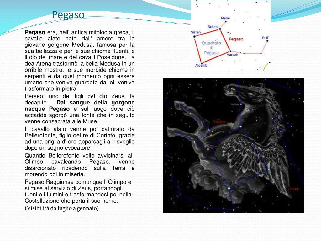Pegaso Pegaso era, nell' antica mitologia greca, il cavallo alato nato dall' amore tra la giovane gorgone Medusa, famosa per la sua bellezza e per le sue chiome fluenti, e il dio del mare e dei cavalli Poseidone. La dea Atena trasformò la bella Medusa in un orribile mostro, le sue morbide chiome in serpenti e da quel momento ogni essere umano che veniva guardato da lei, veniva trasformato in pietra. Perseo, uno dei figli del dio Zeus, la decapitò . Dal sangue della gorgone nacque Pegaso e sul luogo dove ciò accadde sgorgò una fonte che in seguito venne consacrata alle Muse. Il cavallo alato venne poi catturato da Bellerofonte, figlio del re di Corinto, grazie ad una briglia d' oro apparsagli al risveglio dopo un sogno evocatore. Quando Bellerofonte volle avvicinarsi all' Olimpo cavalcando Pegaso, venne disarcionato ricadendo sulla Terra e morendo poi in miseria. Pegaso Raggiunse comunque l' Olimpo e si mise al servizio di Zeus, portandogli i tuoni e i fulmini e trasformandosi poi nella Costellazione che porta il suo nome. (Visibilità da luglio a gennaio)
