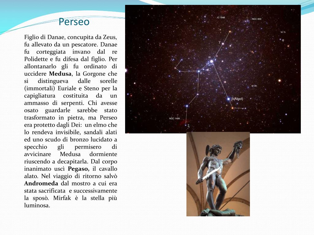 Perseo Figlio di Danae, concupita da Zeus, fu allevato da un pescatore. Danae fu corteggiata invano dal re Polidette e fu difesa dal figlio. Per allontanarlo gli fu ordinato di uccidere Medusa, la Gorgone che si distingueva dalle sorelle (immortali) Euriale e Steno per la capigliatura costituita da un ammasso di serpenti. Chi avesse osato guardarle sarebbe stato trasformato in pietra, ma Perseo era protetto dagli Dei: un elmo che lo rendeva invisibile, sandali alati ed uno scudo di bronzo lucidato a specchio gli permisero di avvicinare Medusa dormiente riuscendo a decapitarla. Dal corpo inanimato uscì Pegaso, il cavallo alato. Nel viaggio di ritorno salvò Andromeda dal mostro a cui era stata sacrificata e successivamente la sposò. Mirfak è la stella più luminosa.