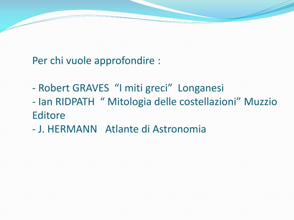 Per chi vuole approfondire :- Robert GRAVES “I miti greci” Longanesi- Ian RIDPATH “ Mitologia delle costellazioni” Muzzio Editore- J. HERMANN Atlante di Astronomia