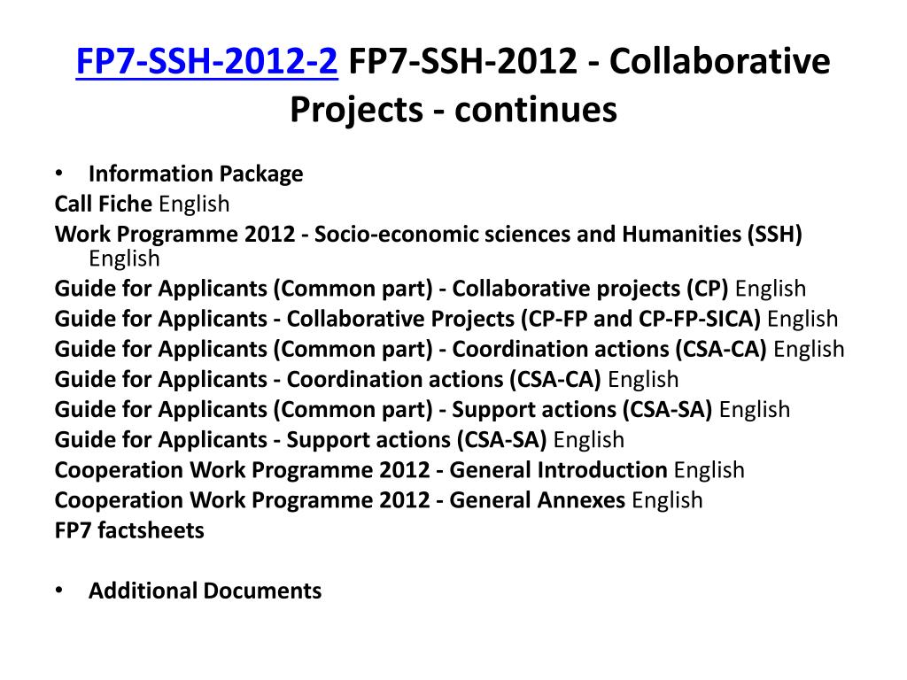 FP7-SSH-2012-2 FP7-SSH-2012 - Collaborative Projects - continues • Information Package Call Fiche English Work Programme 2012 - Socio-economic sciences and Humanities (SSH) English Guide for Applicants (Common part) - Collaborative projects (CP) English Guide for Applicants - Collaborative Projects (CP-FP and CP-FP-SICA) English Guide for Applicants (Common part) - Coordination actions (CSA-CA) English Guide for Applicants - Coordination actions (CSA-CA) English Guide for Applicants (Common part) - Support actions (CSA-SA) English Guide for Applicants - Support actions (CSA-SA) English Cooperation Work Programme 2012 - General Introduction English Cooperation Work Programme 2012 - General Annexes English FP7 factsheets • AdditionalDocuments